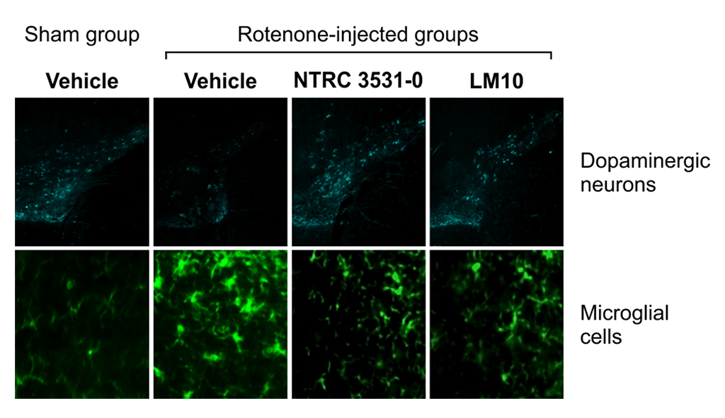 Immagini microscopiche di cellule dopaminergiche e microgliali immuno-etichettate nella substantia nigra dei topi. L'iniezione con rotenone si traduce in un numero ridotto di neuroni dopaminergici ed in un aumento del volume di cellule microgliali, che viene contrastato dal trattamento con gli inibitori del TDO NTRC 3531-0 e LM10. / Microscopic images of immuno-labelled dopaminergic and microglial cells in the substantia nigra of mice. Injection with rotenone results in a reduced number of dopaminergic neurons, and an increased volume of microglial cells, which is counter-acted by treatment with the TDO inhibitors NTRC 3531-0 and LM10.